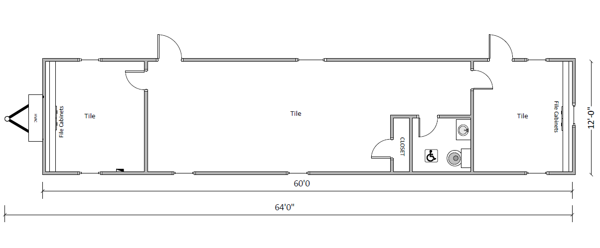 This 12 x 64 Mobile Office Trailer has 2 private offices and 1 restroom.