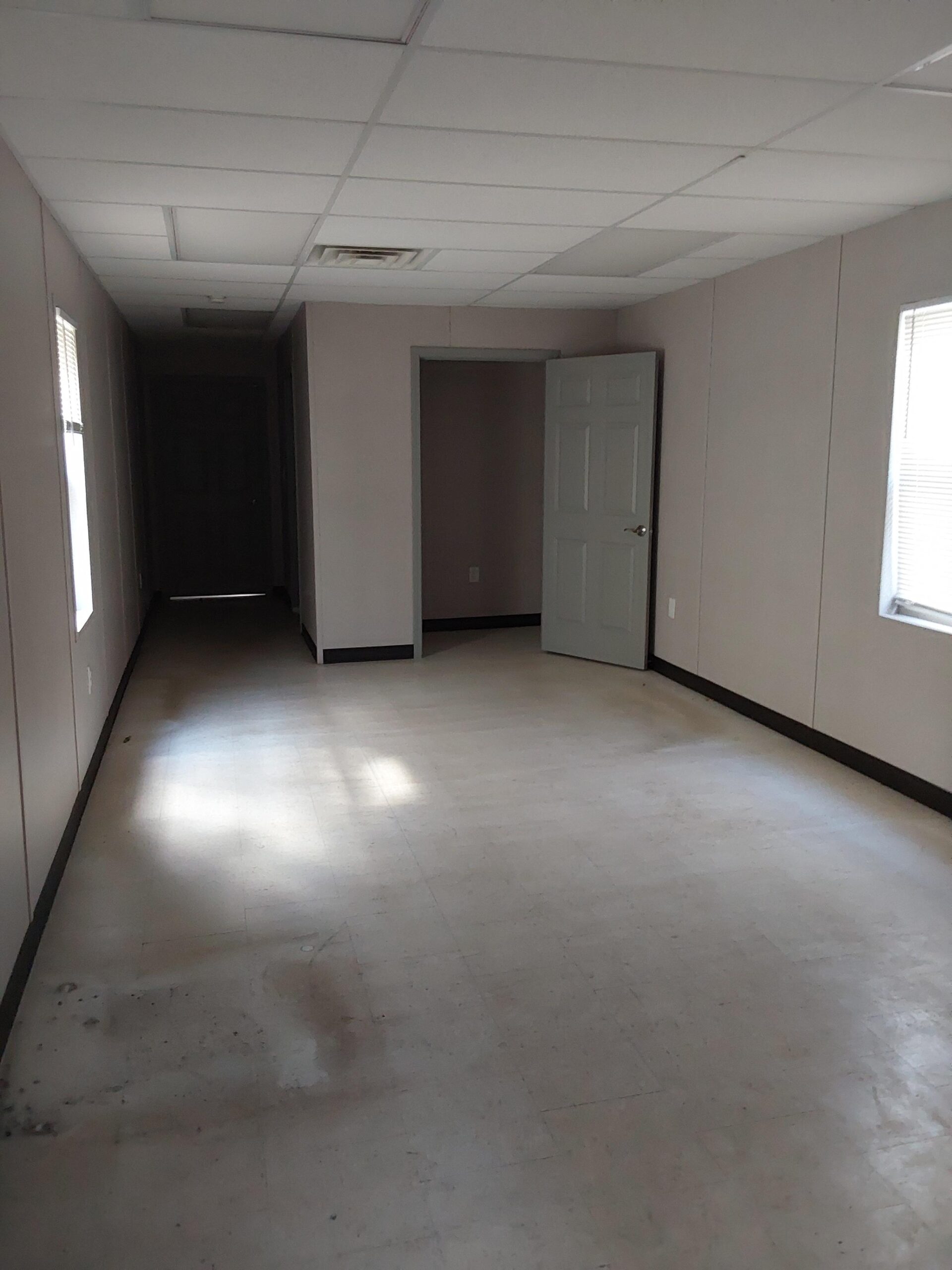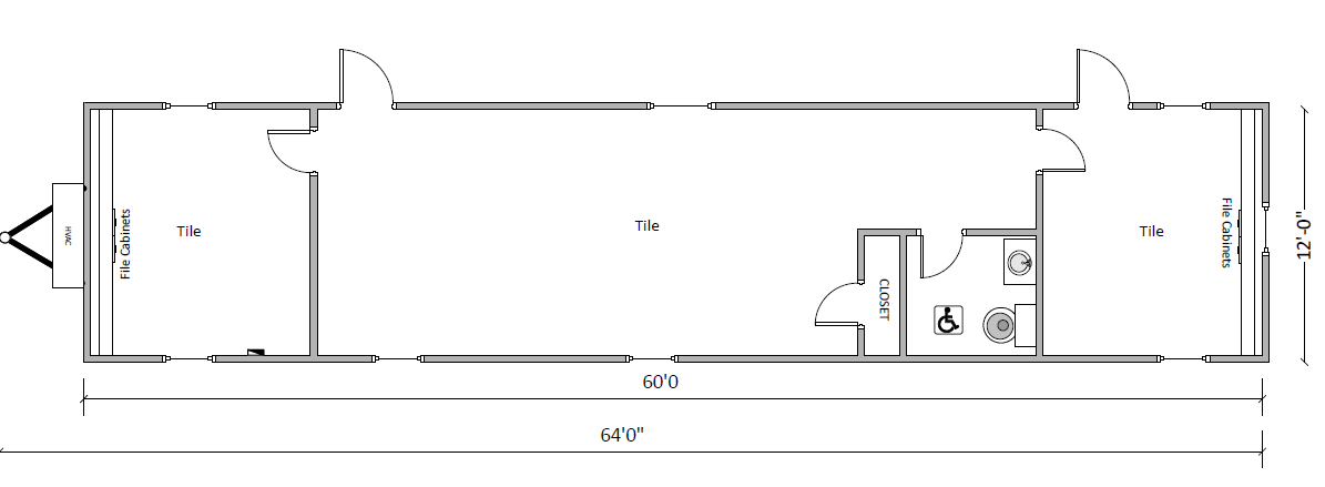 This 12 x 64 Mobile Office Trailer has 2 private offices and 1 restroom.